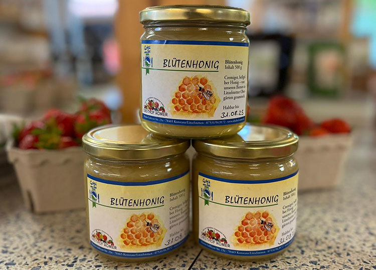Wir haben 10 eigene Bienenvölker. Diese werden von dem erfahrenen Imker Michael Lella umhegt und gepflegt. Zur Blütezeit stehen die Bienen in unserer Kirschplantage am Neuhof. Neben dem Sammeln des beliebten Obstblütenhonigs, sorgen sie für eine gute Befruchtung unserer ca 50000 Obstbäume. Da unsere Bienen nie weiter als 40 Kilometer vom See weg sind, trägt unser Honig selbstverständlich das „Gutes vom See“ Label! Beim Blütenhonig müssen Sie sich ranhalten – der ist immer gleich weg! (Siehe Foto)
